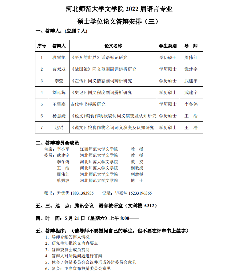 2022届语言学硕士研究生学位论文答辩安排(21日答辩)